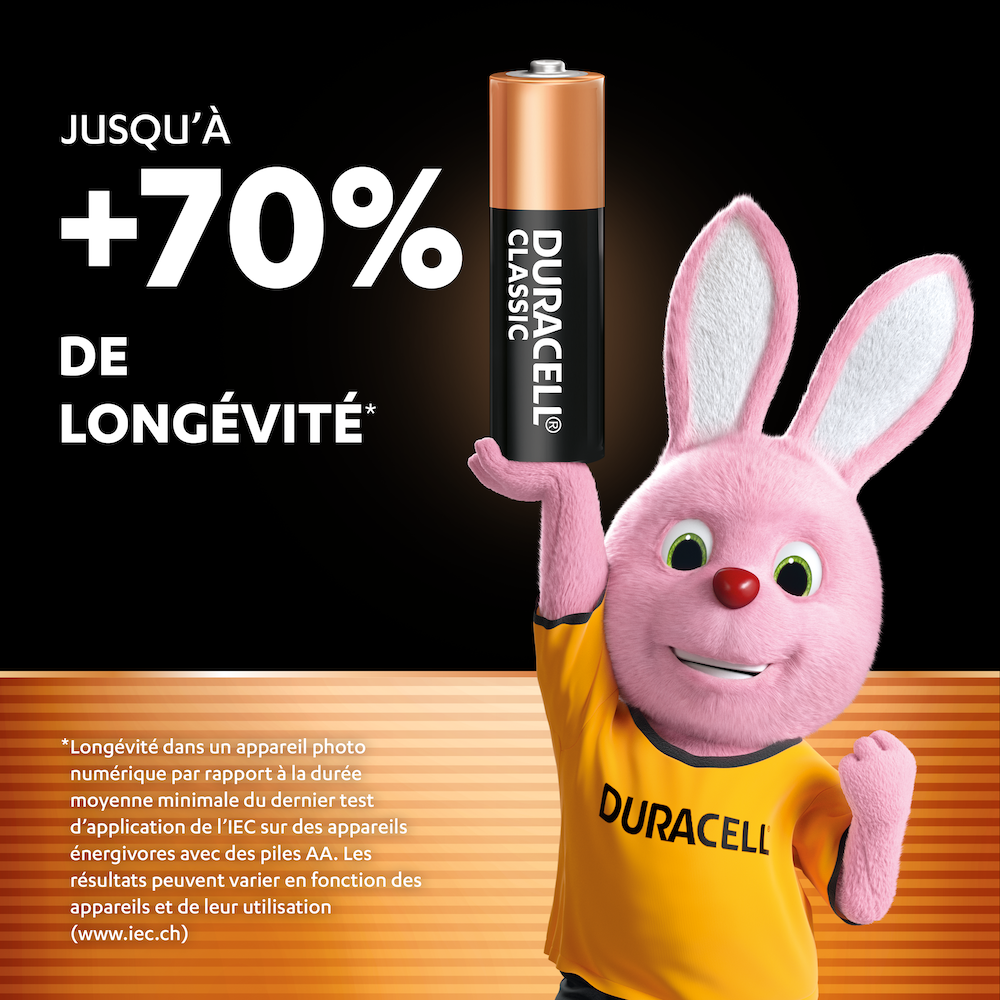 * Longévité dans un appareil photo numérique par rapport à la durée moyenne minimale du dernier test d’application de l’IEC sur des appareils énergivores avec des piles AA. Les résultats peuvent varier en fonction des appareils et de leur utilisation (www.iec.ch)
