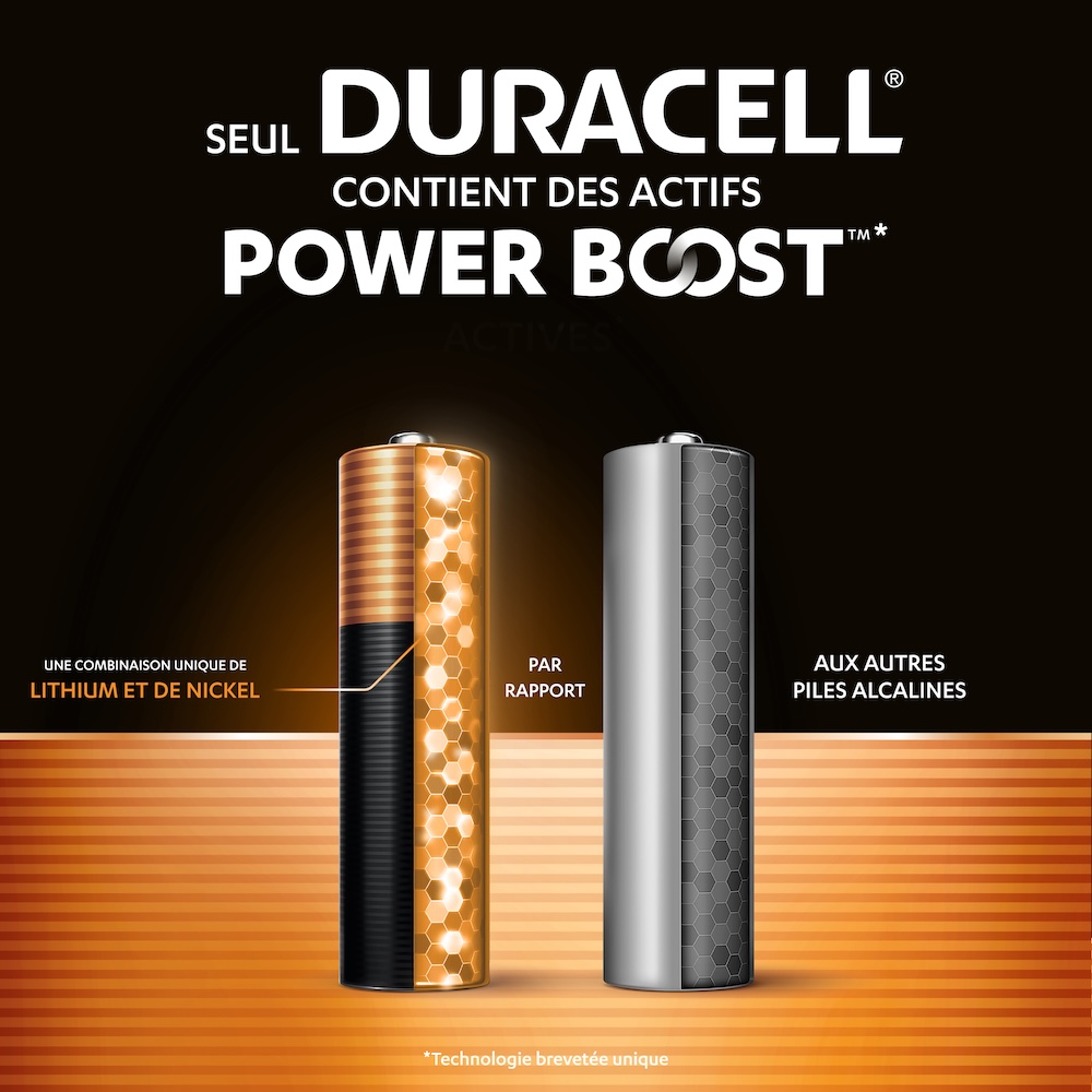 Duracell vous propose une large vaste gamme de piles pour les appareils électroniques qui nécessitent une alimentation fiable. Les piles AA Duracell Plus sont des piles alcalines idéales pour alimenter tous vos appareils courants. La pile AA Duracell Plus offre jusqu’à 100 % plus de longévité* (*Performance de longévité comparée à la durée moyenne minimum du test standard IEC 2021 pour les piles de format AA sur les appareils photos numériques. Les résultats peuvent varier suivant l’appareil ou l’utilisation (site web IEC). Les piles Duracell inutilisées peuvent conserver toute leur énergie jusqu’à 10 ans dans leur emballage et dans des conditions normales de stockage. Duracell vous recommande ces piles pour tous vos appareils courants tels que des appareils photo numériques, flashs d’appareil photo, jouets ou encore mini-chaînes hifi de type boombox. Elles conviennent aussi bien sûr parfaitement à d’autres appareils régulièrement utilisés comme les lampes de poche, les consoles de jeux portables, les rasoirs, les brosses à dents et tout autre appareil électrique. Duracell fut même la première pile à être allée sur la lune en participant à la mission Apollo 11 en 1969.
